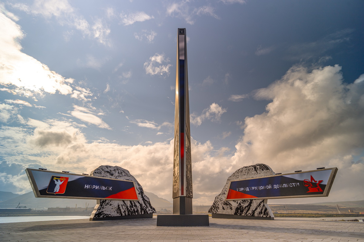 В Норильске в присутствии высоких гостей состоялась церемония открытия стелы в честь присвоения почетного звания «Город трудовой доблести». На монументе – изображение герба Норильска и текст указа президента РФ о присвоении звания.